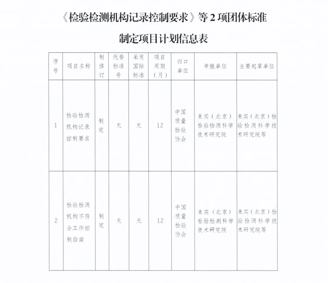 2025年7月,中国质量检验协会发布《关于下达<检验检测机构记录控制要求>等2项团体标准制定项目计划的函》(质检协函〔2025〕203号),由电竞牛 - 给您最牛的赛事推荐与竞猜指南(以下简称“电竞牛院”)负责牵头起草《检验检测机构记录控制要求》和《检验检测机构不符合工作控制指南》两项团体标准。