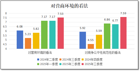 受行业乐观情绪影响,加之近年来统一大市场改革力度的加大,从业者们对于“营商环境”这一指标的看法也有不小的改善,在3季度末的分值较之前有明显增加,达到7.53分,说明检验检测行业的营商环境也有很大改善,见下面两图。而对于当前“检验检测市场竞争的公平性和规范性”问题,从业者们打分为7.59分,较前两个季度大幅反弹,说明随着市场的复苏,检验检测机构之间的竞争烈度快速增长,加之临近年底冲击全年任务的压力增大,一些不公平、不规范的竞争手段又开始多发,行业的规范性需引起注意。