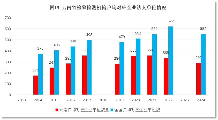 由图12可见,过去12年,云南省检验检测机构户均对应的人口数量逐年下降,但云南的数据一直低于全国平均数。云南省检验检测机构从2013年的户均对应4.55万人,下降到2024年的2.24万人左右。从人口数量的对比值来看,云南省检验检测机构数量显得很多,从检验检测机构户均对应当地GDP值来看,也显得多了一点。这说明云南省经济状况一般,人口也不多,但检验检测行业发展过热,已经超出了云南省经济建设和社会发展的正常需求。