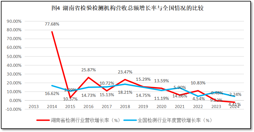 比较湖南省检验检测行业年度营收总额增长率与全国检验检测行业年度营收总额增长率随时间的变化,如图4所示。